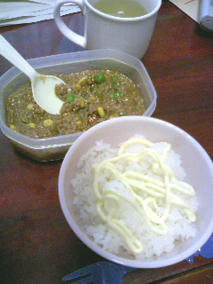 ご飯の隣りにあるのは、ジャコを入れたドライカレーもどき…。